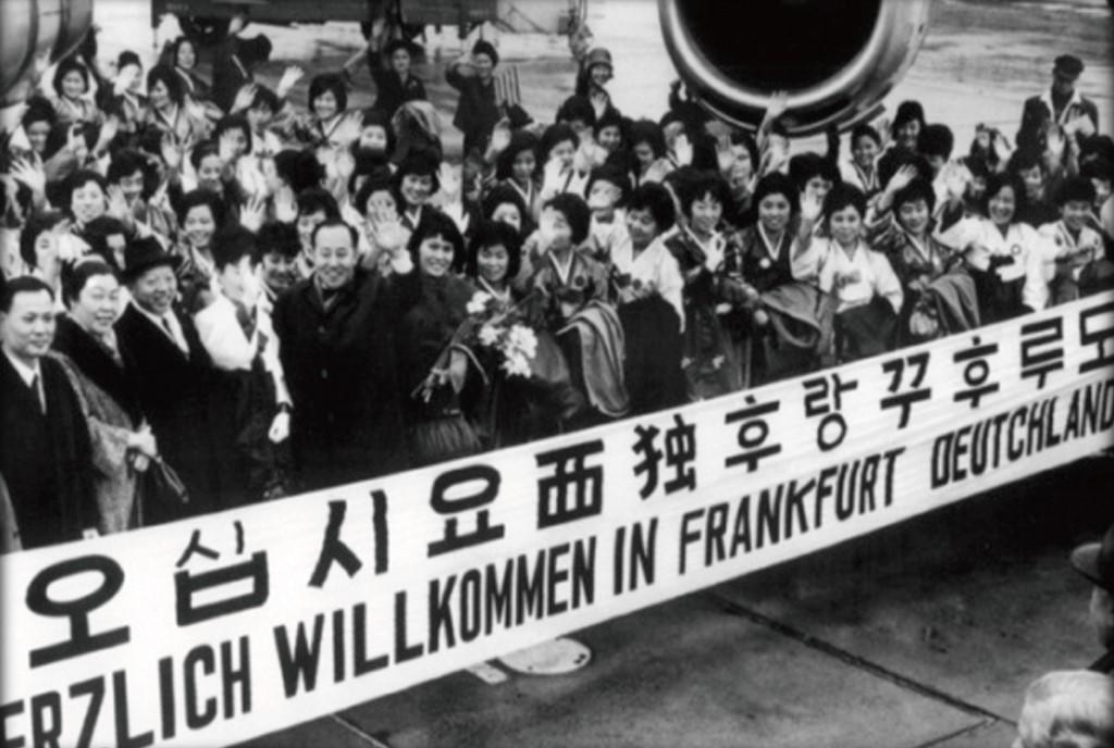 1966년, 독일 프랑크푸르트 공항에 도착한 파독 간호사들이 현지에서 환영받고 있는 모습입니다. 독일어와 한국어로 "(어서)오십시요"라는 문구가 적힌 플래카드가 눈에 띄며, 많은 사람들이 환영의 인사를 건네고 있습니다. 한복을 입고 밝게 웃으며 손을 흔드는 간호사들의 모습에서 낯선 타국에서의 시작에 대한 설렘과 다짐이 느껴집니다. 이들은 독일에서 간호사로서의 역할을 수행하며, 독일과 한국 간의 우호적인 관계를 증진시키는 중요한 역할을 담당하게 됩니다.